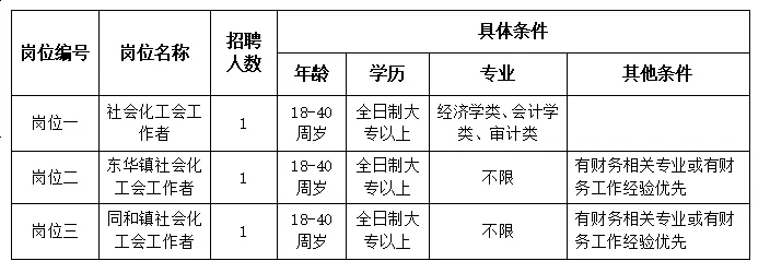 (五)具有全日制大專以上文化程度,年齡18-40周歲,性別不限;崗位一專業(yè)必須為經(jīng)濟學(xué)類、會計學(xué)類、審計類專業(yè);崗位二、崗位三專業(yè)不限,同等條件下,有財務(wù)相關(guān)專業(yè)或有財務(wù)工作經(jīng)驗優(yōu)先;