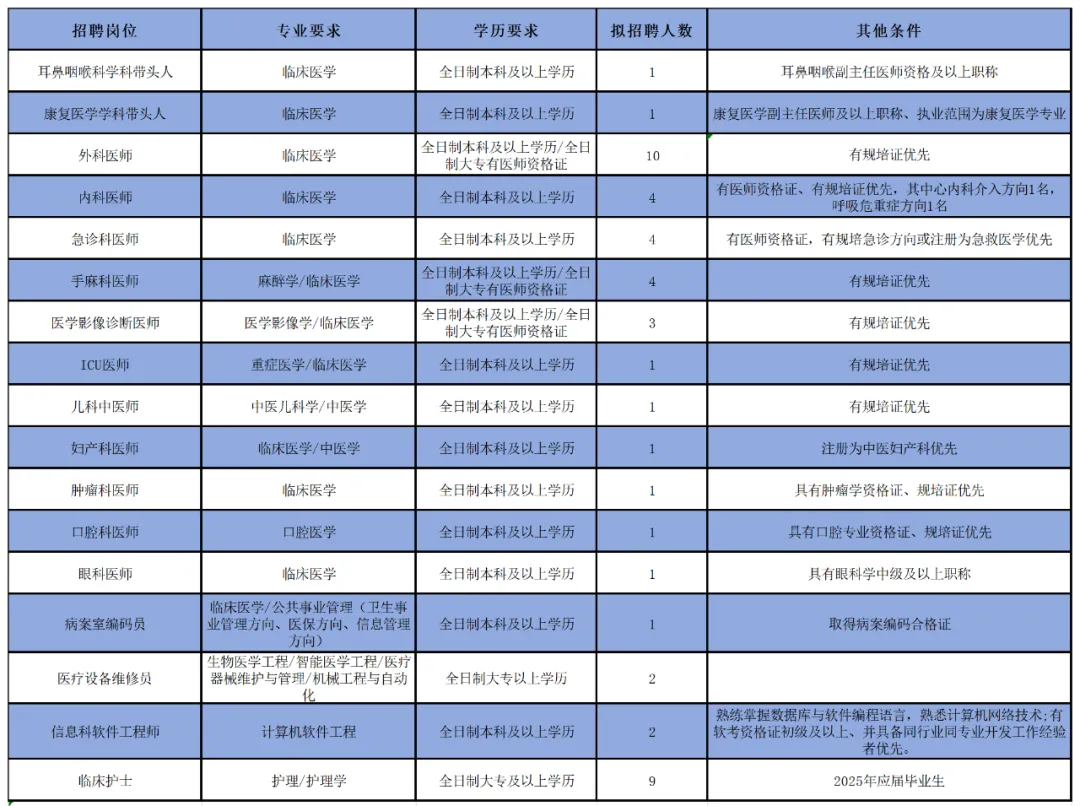招聘對(duì)象:1、應(yīng)屆畢業(yè)生;2、規(guī)培生;3、已取得執(zhí)業(yè)資格的在崗人員