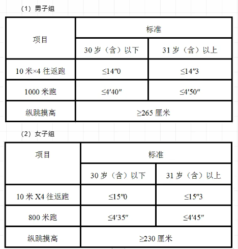 3.參照《關于印發(fā)公安機關錄用人民警察體能測評項目和標準(暫行)的通知》(人社部發(fā)〔2011〕48號)的項目及測試規(guī)則,結合《公安民警體育鍛煉達標手冊》成績標準,體能測評的項目和標準如下: