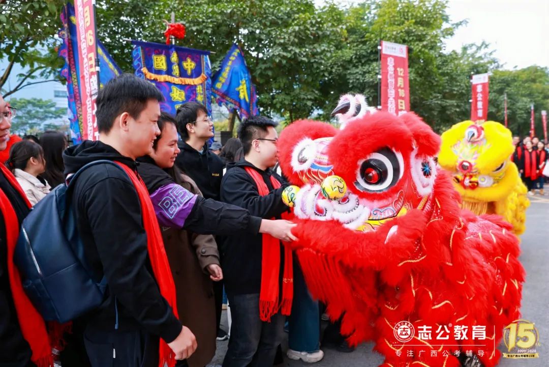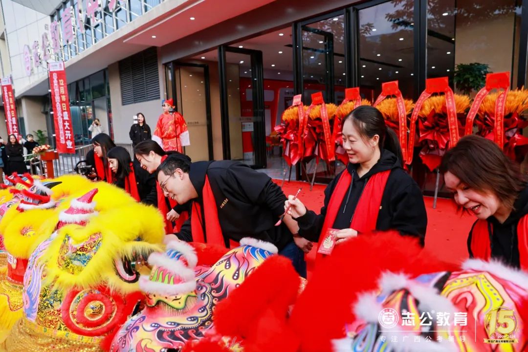 志公教育還專門請來了舞獅隊(duì),舞獅點(diǎn)睛是重頭戲,董事長李勇帶領(lǐng)著公司領(lǐng)導(dǎo)們手持毛筆蘸取朱砂,對獅頭天庭進(jìn)行點(diǎn)睛。