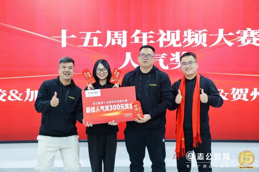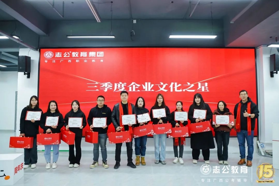 一直以來,志公教育都秉承著“12條企業(yè)文化核心價值觀”,包括客戶原則——以學(xué)員為中心”、“管理原則——人人都是經(jīng)營者”等12項(xiàng)原則,扎根廣西本土公考,全力服務(wù)每一位志公學(xué)員。在董事長李勇的正確領(lǐng)導(dǎo)下,在廣大學(xué)員的支持下,在全體員工的共同努力下,志公教育從無到有,從小到大,不斷夯實(shí)發(fā)展基礎(chǔ),贏得了客戶的信賴和品牌形象。全體志公人將堅(jiān)定目標(biāo)齊奮斗、凝心聚力再出發(fā),為志公高質(zhì)量發(fā)展再立新功。