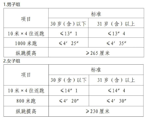 參加體能測評人員為筆試考試成績合格的考生。體能測評的標(biāo)準(zhǔn):參照《關(guān)于印發(fā)公安機(jī)關(guān)錄用人民警察體能測評項(xiàng)目和標(biāo)準(zhǔn)(暫行)的通知》(人社部發(fā)〔2011〕48號)的標(biāo)準(zhǔn)。
