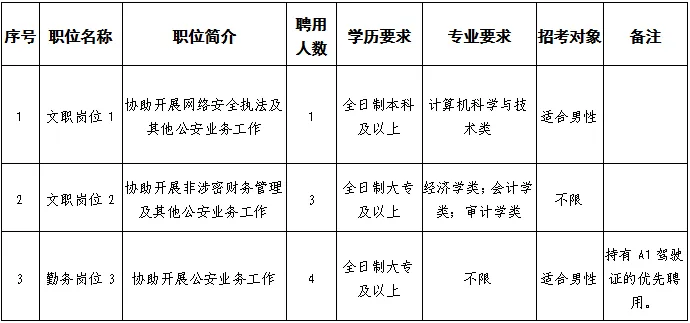 (六)同等條件下,優(yōu)先招聘公安烈士和因公犧牲公安民警、在職公安民警子女、退役士兵、見義勇為積極分子和先進(jìn)個(gè)人、警察類或政法類院校畢業(yè)生、有政法工作經(jīng)驗(yàn)的人員;