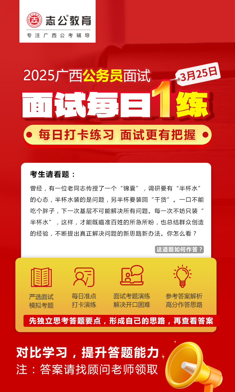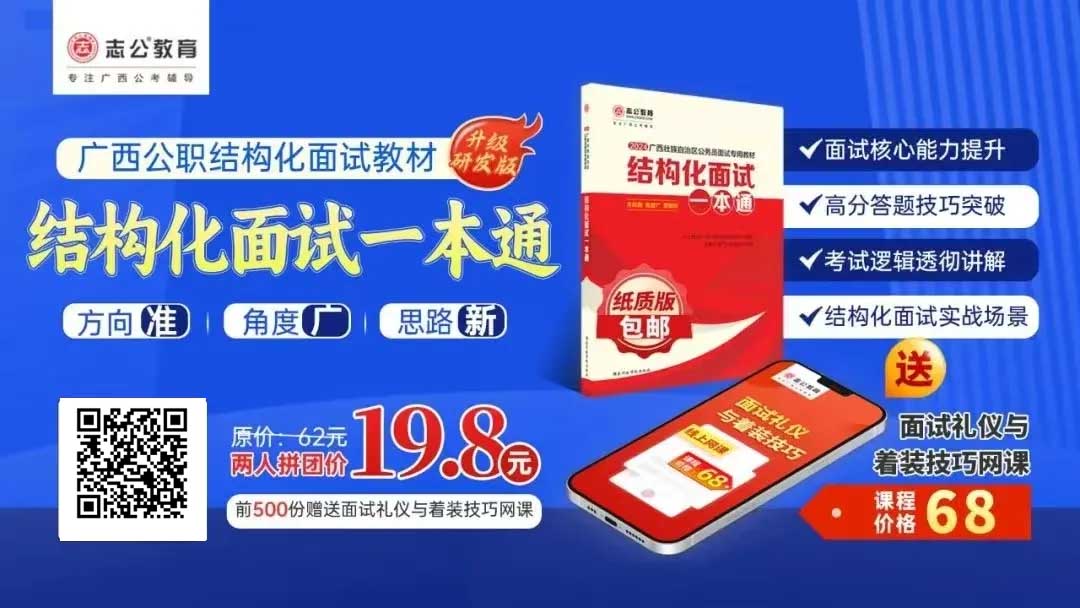 廣西區(qū)考面試準(zhǔn)備需緊扣本土特色,強(qiáng)化邏輯表達(dá)和實(shí)務(wù)能力,同時(shí)注重細(xì)節(jié)(如資格復(fù)審材料、禮儀)。建議從現(xiàn)在起每天練習(xí)2-3套題,持續(xù)積累廣西熱點(diǎn)案例,爭取面試高分!資料已經(jīng)為大家準(zhǔn)備好了,快去看看吧!