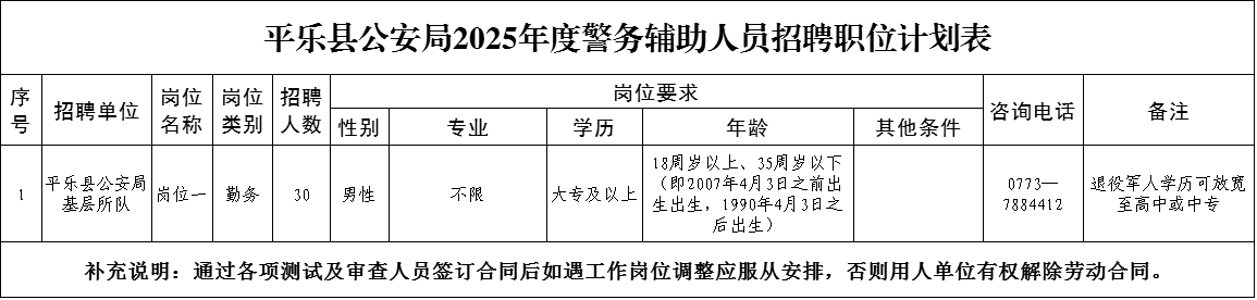 (四)本公告未盡事宜,由平樂(lè)縣公安局公開(kāi)招聘工作領(lǐng)導(dǎo)小組辦公室負(fù)責(zé)解釋。