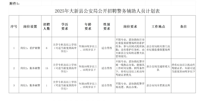 為適應(yīng)當(dāng)前社會治安形勢的需要,進一步充實公安機關(guān)警務(wù)輔助力量,推進平安大新建設(shè),有效維護社會治安穩(wěn)定,根據(jù)《廣西壯族自治區(qū)公安機關(guān)警務(wù)輔助人員條例》《崇左市公安機關(guān)警務(wù)輔助人員管理辦法》《崇左市公安機關(guān)警務(wù)輔助人員管理招聘管理辦法》(試行)等文件精神,經(jīng)縣人民政府同意,大新縣公安局決定面向社會公開招聘警務(wù)輔助人員22名(以下簡稱輔警)?,F(xiàn)將有關(guān)事項公告如下: