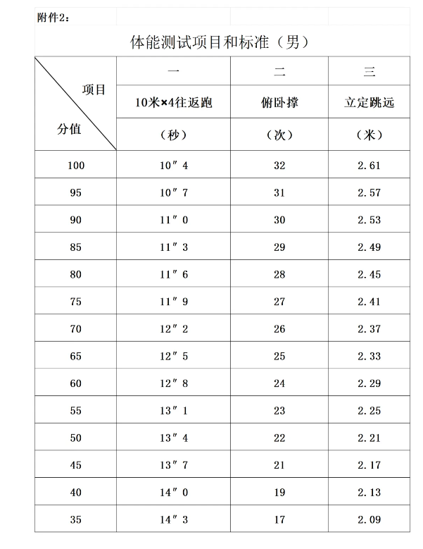 3.體能測試。參照人民警察招錄標(biāo)準(zhǔn)執(zhí)行(具體項目和標(biāo)準(zhǔn)詳見附件2)。測試項目:10米×4往返跑、立定跳遠、俯臥撐,體能測試三項全部達標(biāo)的,方為合格。