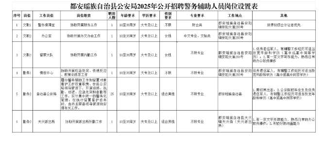 都安瑤族自治縣公安局本次擬招聘警務(wù)輔助人員30人,具體招聘崗位、人數(shù)、資格條件詳見(jiàn)《都安瑤族自治縣公安局2025年公開(kāi)招聘警務(wù)輔助人員崗位設(shè)置表》