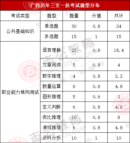 上篇我們寫到,三支一扶的待遇,在廣西這個待遇還算不錯,政策上的支持也非常好,那么預(yù)計這個月月底出公告的三支一扶,啥時候筆試呢?2024年廣西三支一扶筆試時間是7月13日,其筆試科目為《綜合知識》一科,滿分100分?;谕昕忌幕貞?,綜合知識內(nèi)容主要包括公共基礎(chǔ)知識和行測職業(yè)能力測試兩個科目,而各題型的題量及分值如下圖所示: