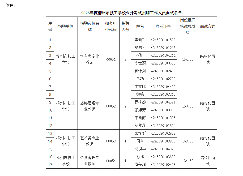 附件:2025年度柳州市技工學校公開考試招聘工作人員面試名單