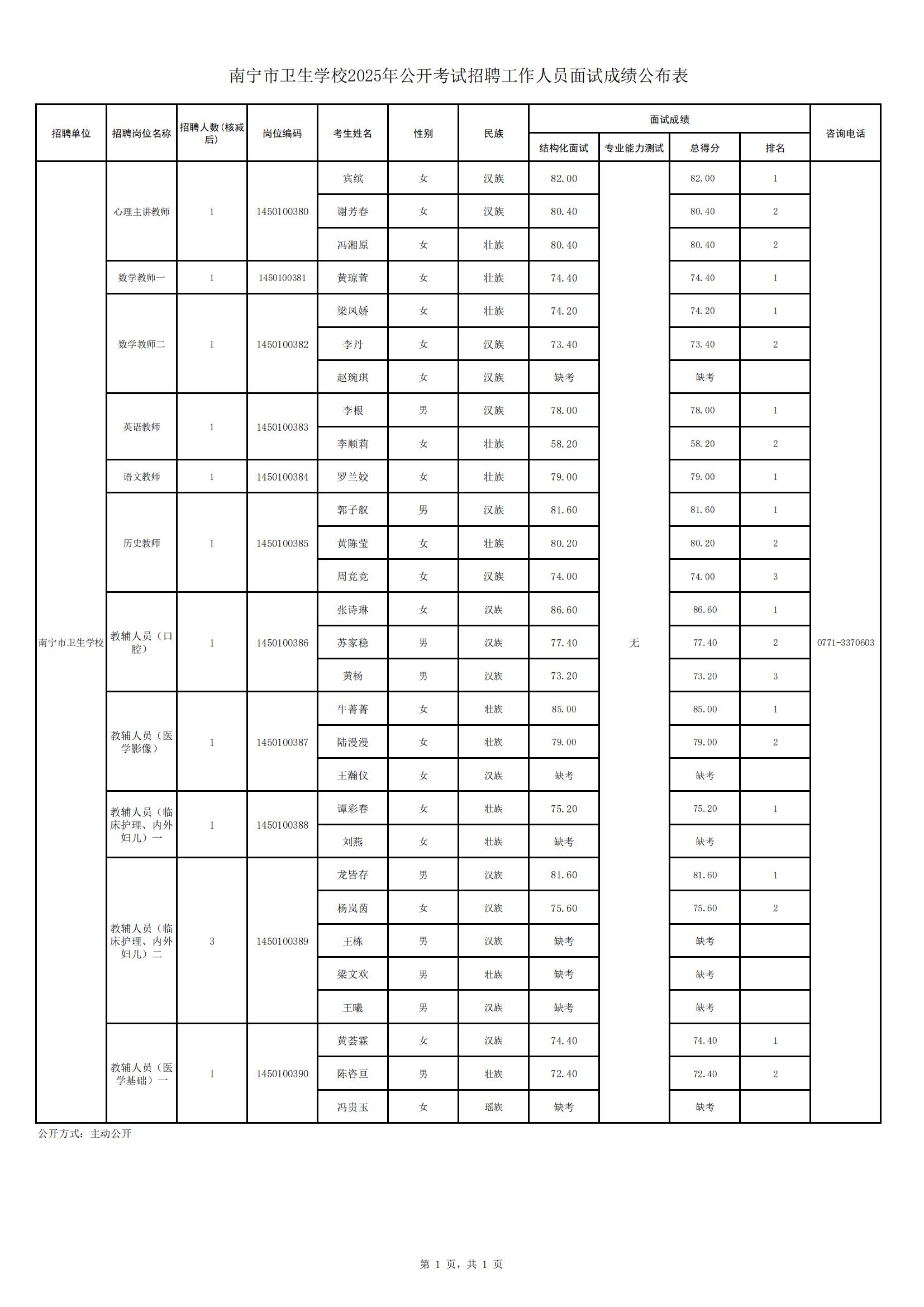 南寧市衛(wèi)生學(xué)校2025年公開考試招聘工作人員面試成績(jī)公布表