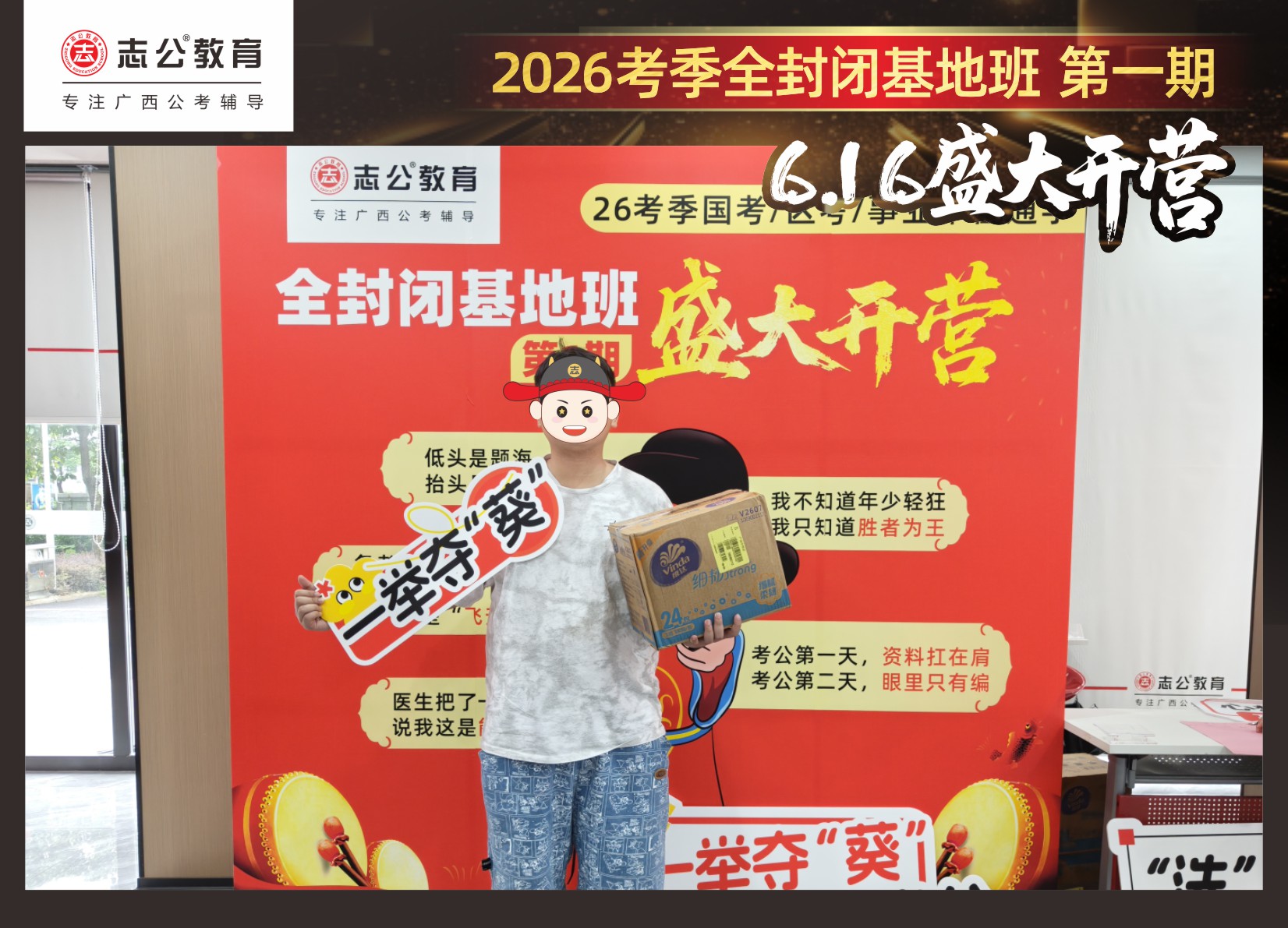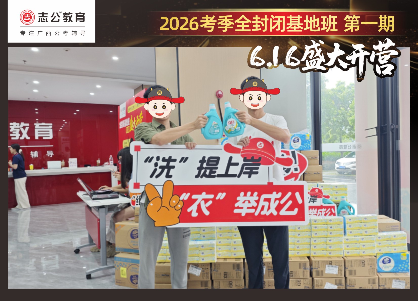 今天的開班還有一系列小活動噢~瞧!——“學員打卡活動”,所有今天到場的基地班學員,通過做一些小任務(wù)的方式,可以到前臺領(lǐng)取生活禮包即可領(lǐng)取生活禮品1份(一提六包的紙巾,或者一瓶洗衣液),這也是志公教育對所有學員的美好祝愿,預(yù)祝大家未來能夠“紙”定成公,“洗”提上/岸,“衣舉成公”!