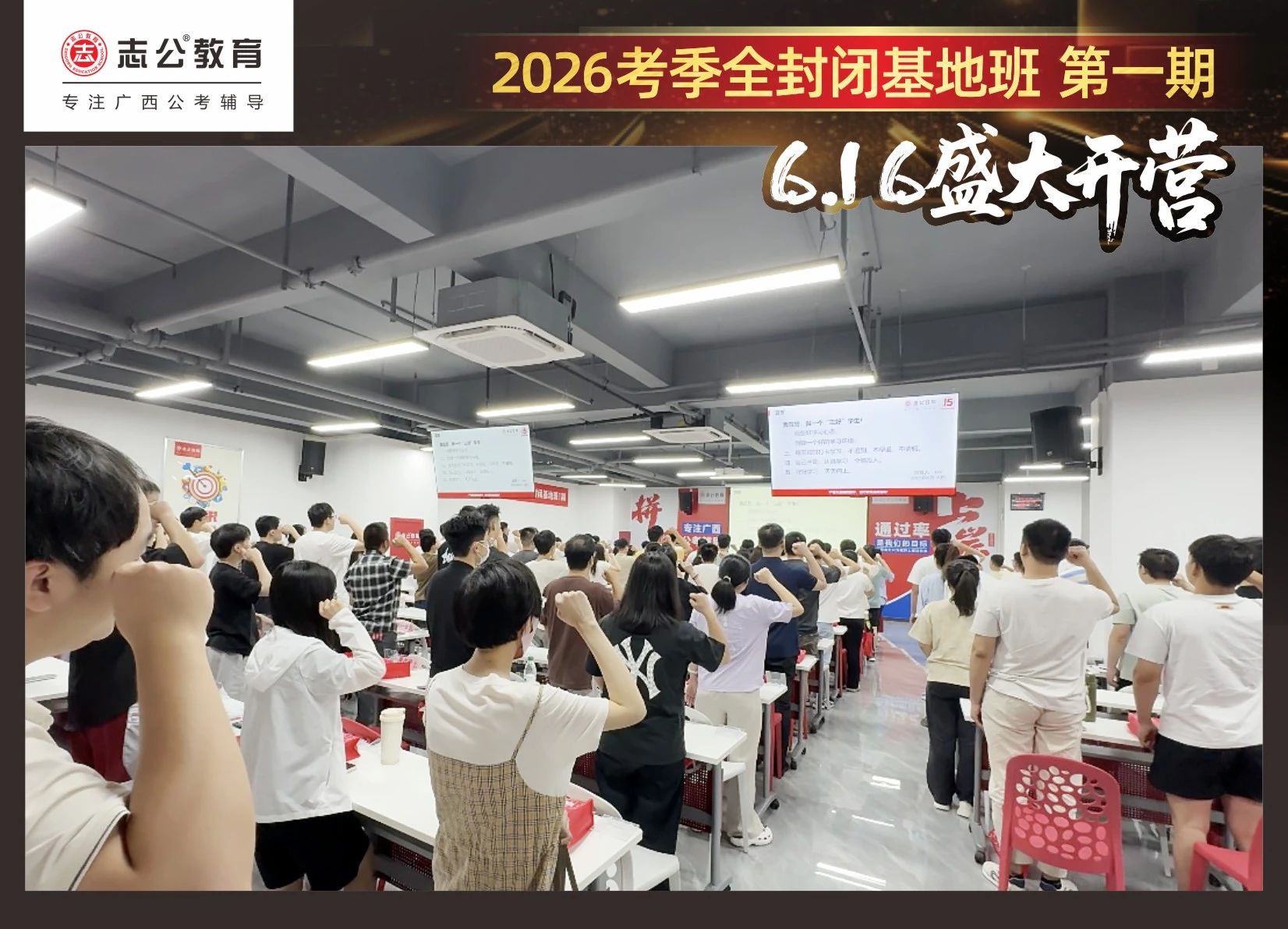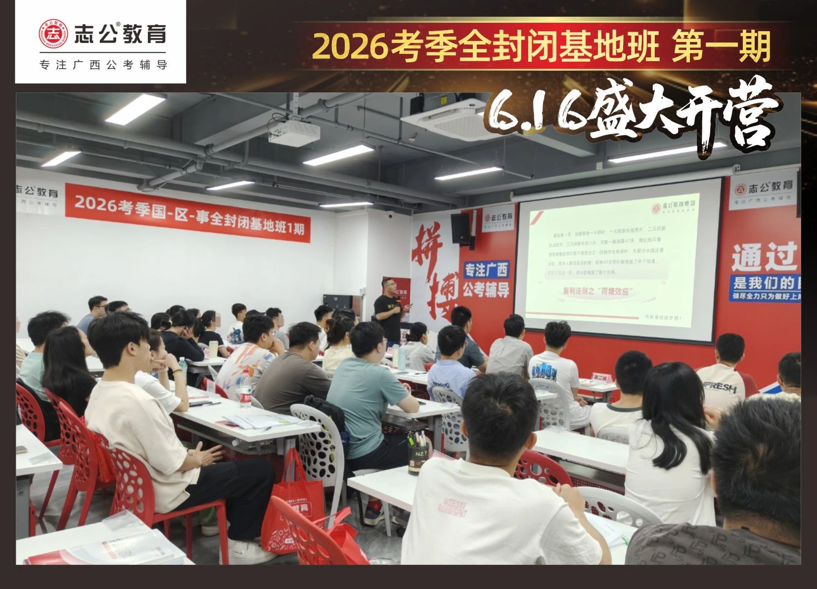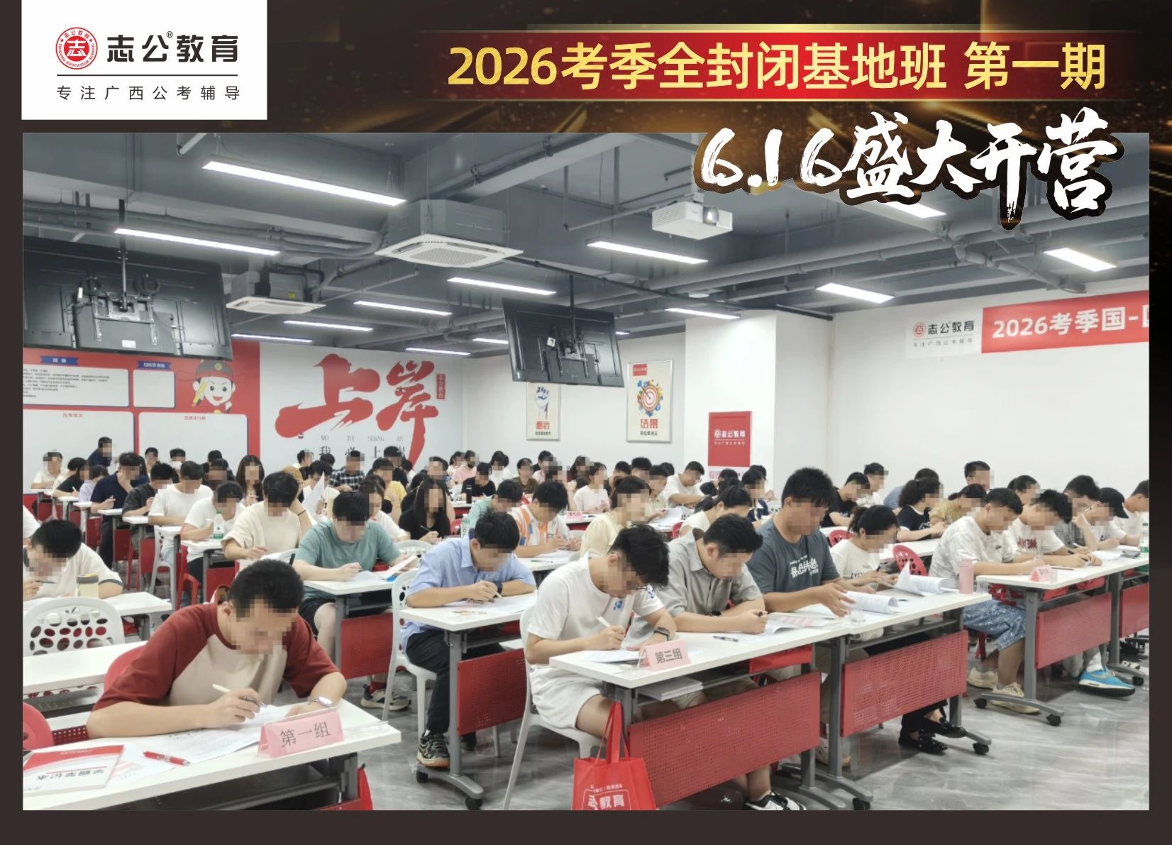大家稍作休息之后,就是咱們期待已久的開班典禮啦!學員們在班主任的引導(dǎo)下分組就坐。大家目光灼灼,熱情高漲,迫不及待想要開啟學習模式。看這座無虛席的盛況,志公26考季全封閉基地班第1期課程實力名不虛傳,各位學員用飽滿的熱情和積極的態(tài)度迎接此次課程的開展,期待大家能夠完成自己的蛻變和成長!