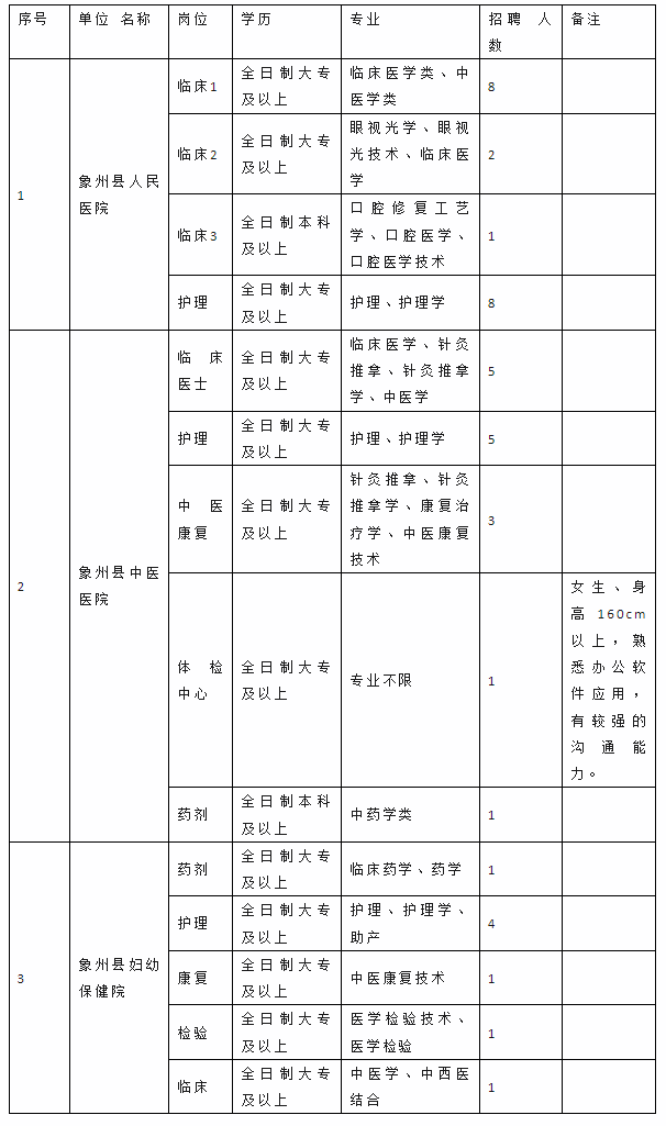 因工作需要,根據(jù)相關(guān)規(guī)定,我單位擬面向社會公開招聘見習(xí)人員42名,其中象州縣人民醫(yī)院19人、象州縣中醫(yī)醫(yī)院15人、象州縣婦幼保健院8人?,F(xiàn)將有關(guān)事項通知如下: