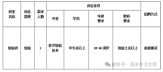 來賓市興賓區(qū)高安鄉(xiāng)衛(wèi)生院是一家集醫(yī)療、預(yù)防保健、康復(fù)醫(yī)療于一體的國家公立基層醫(yī)療機(jī)構(gòu),現(xiàn)有職工45人,服務(wù)人口約2萬人。因工作需要,我院擬向社會公開招聘編制限額外檢驗(yàn)科人員1名,現(xiàn)將有關(guān)招聘事項(xiàng)公告如下:
