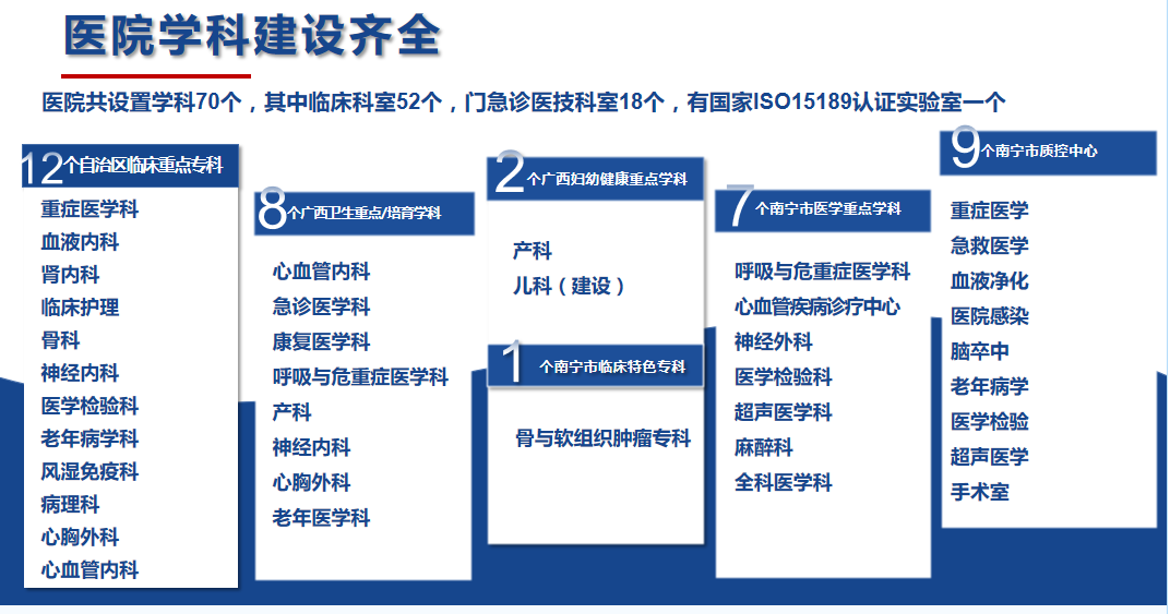 南寧市第一人民醫(yī)院(南寧市兒童先天性心血管疾病研究所、南寧市呼吸道疾病研究所、廣西醫(yī)科大學(xué)第五臨床醫(yī)學(xué)院、廣西醫(yī)科大學(xué)第五附屬醫(yī)院)始建于1914年,是一家擁有百年歷史的國(guó)家三級(jí)甲等綜合性醫(yī)院。醫(yī)院設(shè)有52個(gè)臨床病區(qū),18個(gè)門(mén)診醫(yī)技科室,總開(kāi)放床位1912張(含分院)。醫(yī)院是國(guó)家高級(jí)認(rèn)知中心建設(shè)單位及國(guó)家神經(jīng)介入建設(shè)中心、國(guó)家ISO15189醫(yī)學(xué)檢驗(yàn)認(rèn)證機(jī)構(gòu),國(guó)家聯(lián)盟中心認(rèn)證的胸痛中心、卒中中心;擁有廣西臨床重點(diǎn)??疲ê嘤?2個(gè)、自治區(qū)醫(yī)療衛(wèi)生重點(diǎn)學(xué)科(含培育)8個(gè)、自治區(qū)婦幼健康服務(wù)重點(diǎn)學(xué)科(含建設(shè))2個(gè)、南寧市醫(yī)學(xué)重點(diǎn)學(xué)科7個(gè)、南寧市臨床特色優(yōu)勢(shì)???個(gè),南寧市質(zhì)控中心9個(gè)。醫(yī)院是國(guó)家衛(wèi)健委創(chuàng)面修復(fù)能力建設(shè)和繼續(xù)教育中心教學(xué)基地、國(guó)家級(jí)住院醫(yī)師規(guī)范化培訓(xùn)培訓(xùn)基地,廣西醫(yī)科大學(xué)碩士研究生培養(yǎng)基地,同時(shí)是暨南大學(xué)共建醫(yī)學(xué)教育基地、第十批廣西博士后創(chuàng)新實(shí)踐基地;醫(yī)院還具備國(guó)家藥物臨床試驗(yàn)機(jī)構(gòu)資質(zhì)(含I期研究室);醫(yī)院醫(yī)學(xué)實(shí)驗(yàn)中心獲批廣西科技廳重點(diǎn)實(shí)驗(yàn)室“廣西智慧精準(zhǔn)醫(yī)學(xué)實(shí)驗(yàn)室”,是南寧市衛(wèi)健系統(tǒng)唯一的省級(jí)重點(diǎn)建設(shè)實(shí)驗(yàn)室。2019年在市委市政府支持下,成立南寧市第一人民醫(yī)院醫(yī)療集團(tuán)?,F(xiàn)有27家成員單位,形成“1+4+22”(中心醫(yī)院+4家二級(jí)醫(yī)院+22家基層衛(wèi)生及養(yǎng)老機(jī)構(gòu))一體化格局,推行“三二一”運(yùn)營(yíng)管理模式,逐步構(gòu)建全生命周期健康管理鏈。