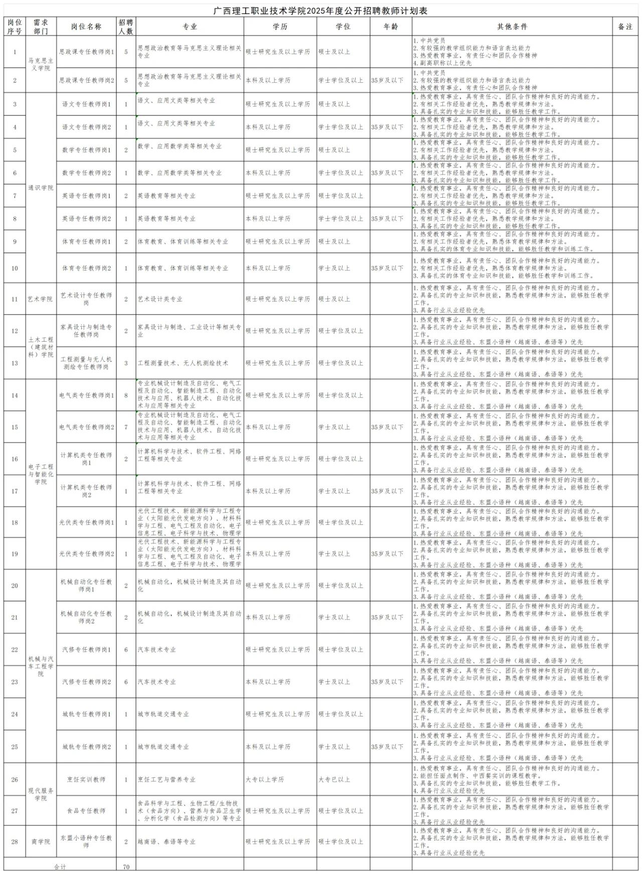 詳見《廣西理工職業(yè)技術學院2025年度公開招聘教師計劃表》