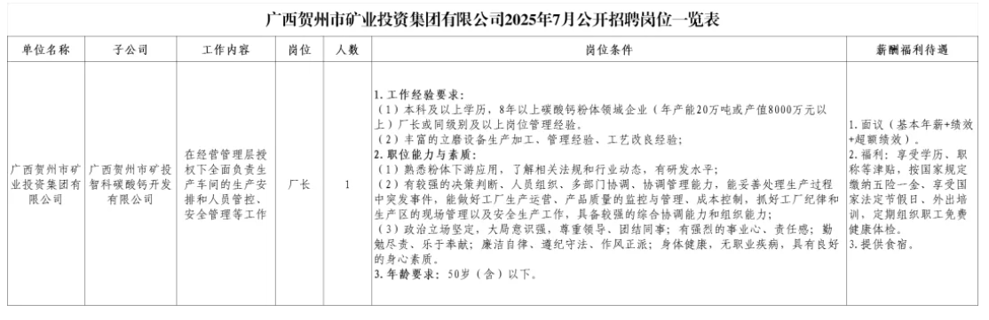 具體內容詳見附件1《廣西賀州市礦業(yè)投資集團有限公司2025年7月公開招聘崗位一覽表》