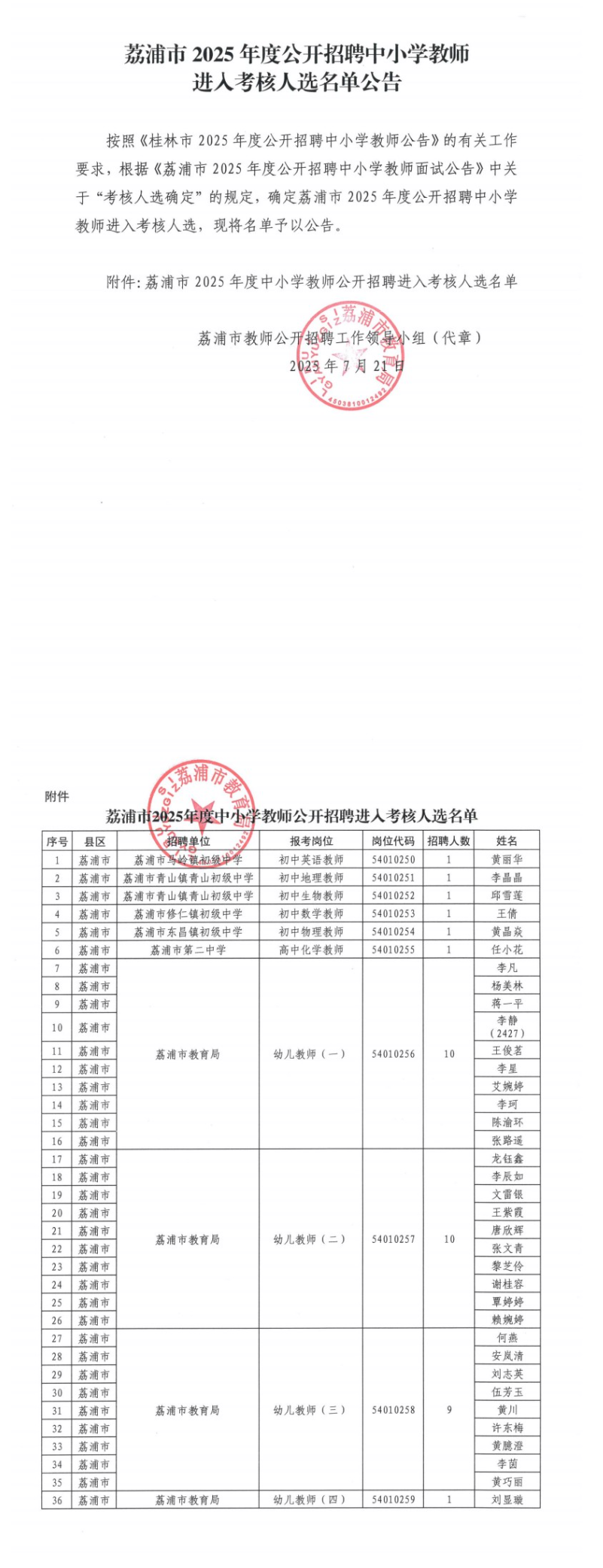 荔浦市2025年度公開(kāi)招聘中小學(xué)教師進(jìn)入考核人選名單公告