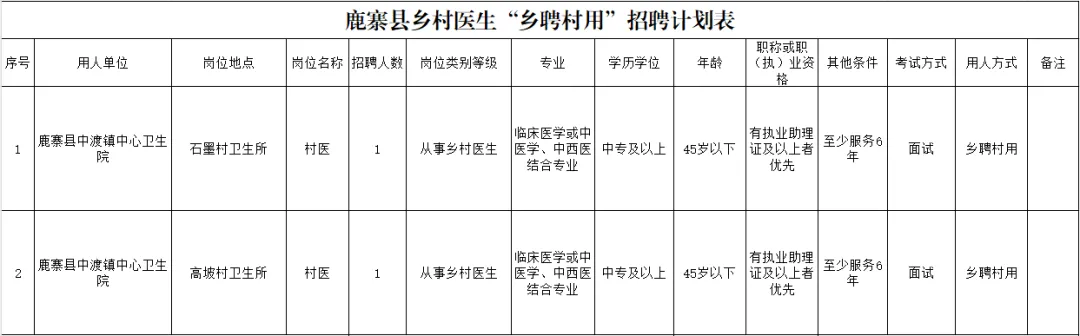 因工作需要,我院擬向社會(huì)公開招聘鄉(xiāng)村醫(yī)生2名,現(xiàn)將有關(guān)招聘事項(xiàng)公告如下: