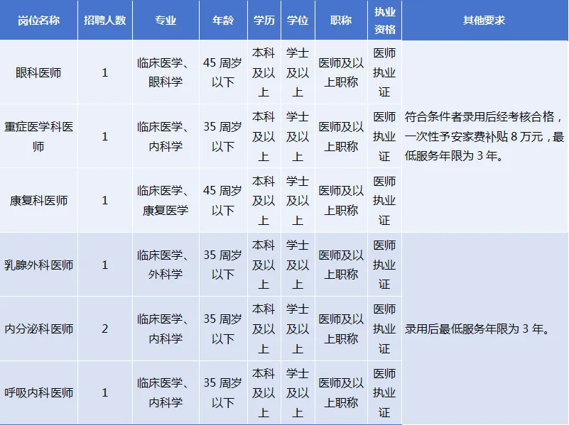 ■ 眼科、康復(fù)醫(yī)學(xué)科、重癥醫(yī)學(xué)科醫(yī)師為我院緊缺崗位人才,符合條件錄用者,經(jīng)試用考核合格后可享受安家費補貼。