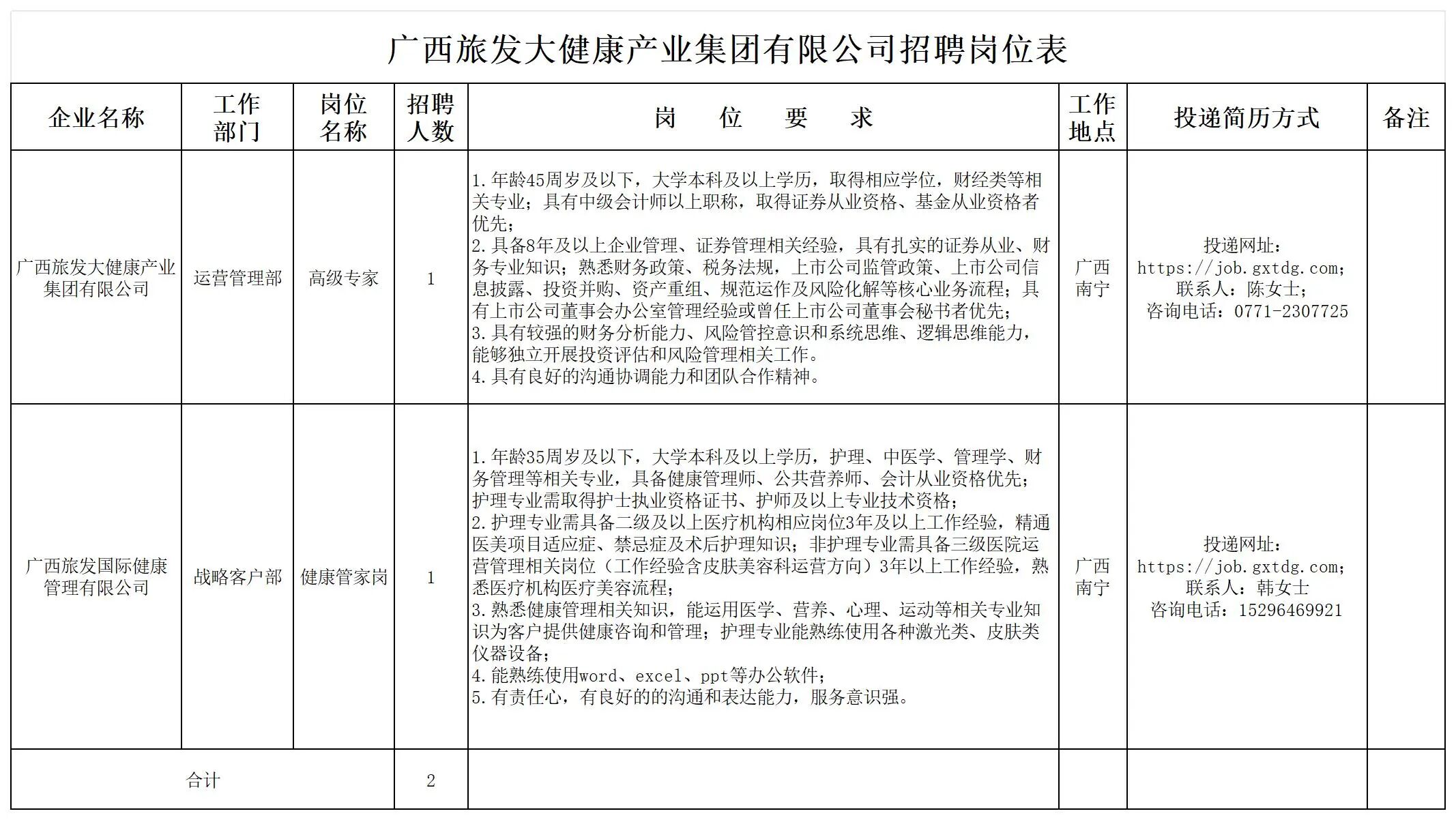 廣西旅發(fā)大健康產(chǎn)業(yè)集團(tuán)有限公司有關(guān)崗位員工2名(詳見(jiàn)招聘崗位表)。