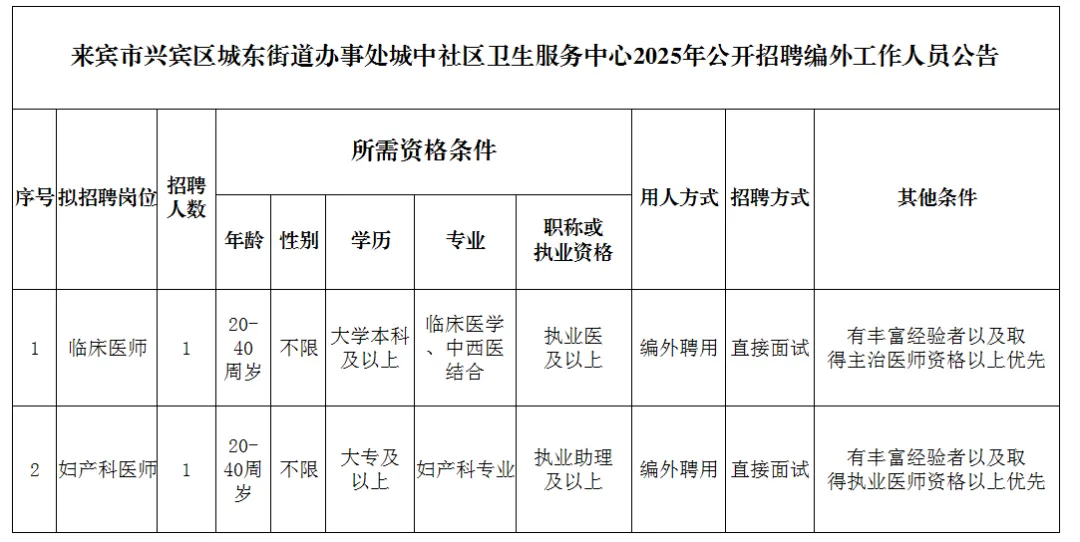 2025年來賓市興賓區(qū)城中社區(qū)衛(wèi)生服務(wù)中心公開招聘編外工作人員公告