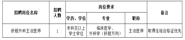 根據(jù)醫(yī)院發(fā)展需要,現(xiàn)面向社會(huì)急招肝膽外科主治醫(yī)師1人,有關(guān)招聘事項(xiàng)公告如下: