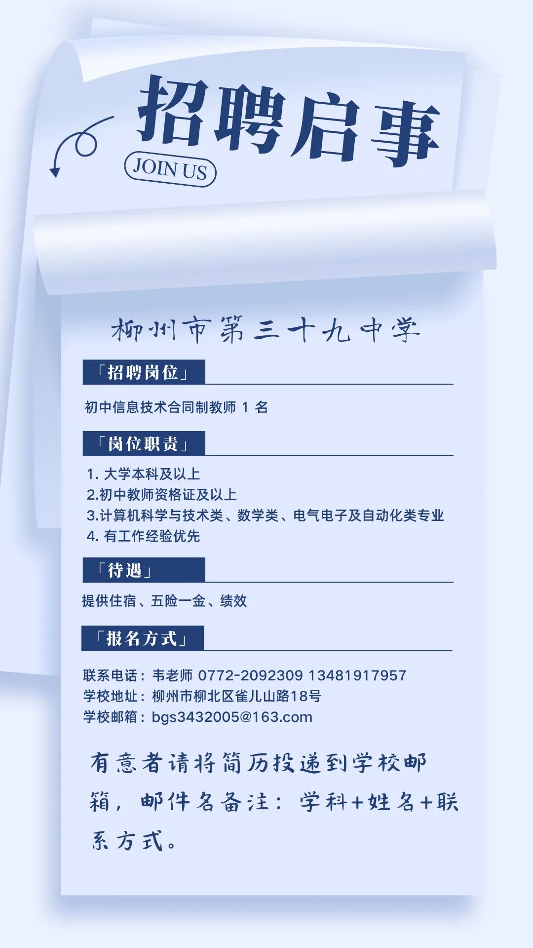 2025年柳州市第三十九中學(xué)招聘初中信息技術(shù)合同制教師1名