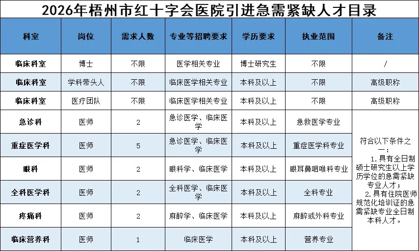 符合條件者享受梧州市高層次(緊缺)人才引進(jìn)政策和梧州市紅十字會(huì)醫(yī)院急需緊缺人才引進(jìn)政策,提供事業(yè)單位編制及安家費(fèi):