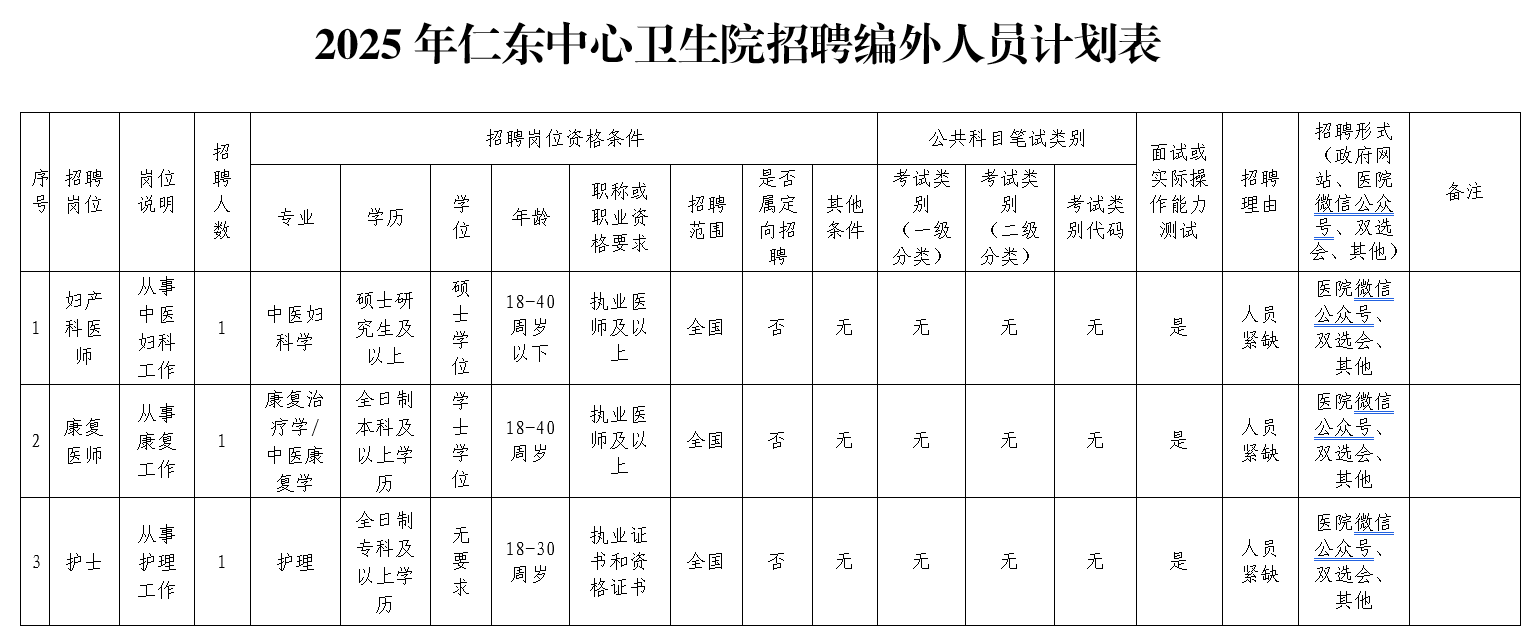 7.學歷、專業(yè)及其他任職要求詳見仁東中心衛(wèi)生院招聘編外人員計劃表。
