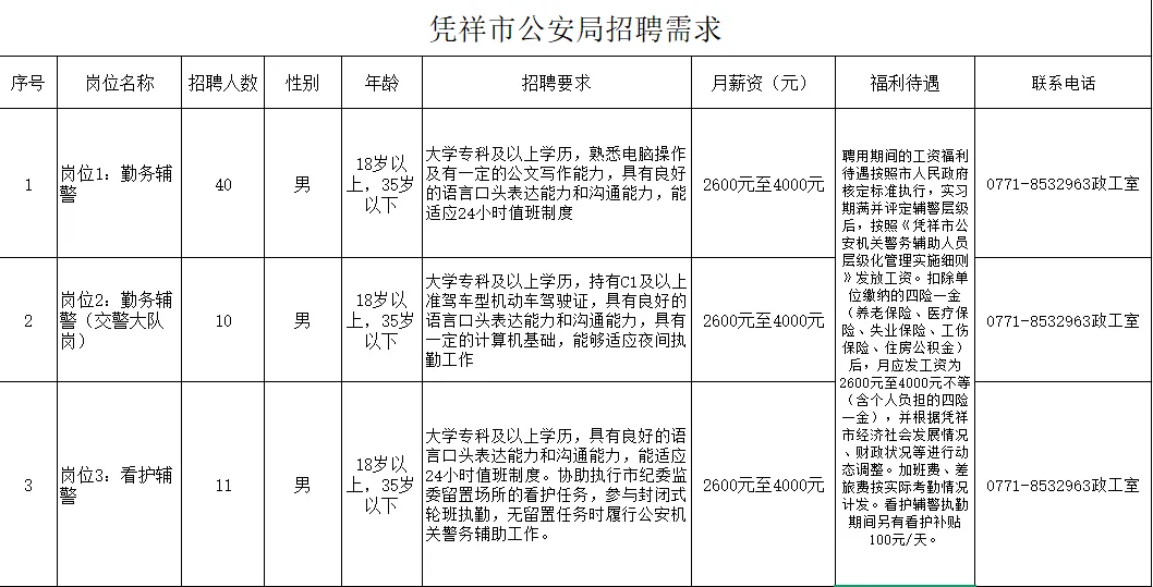 (二) 報(bào)名地點(diǎn)憑祥市公安局(憑祥市北大路69號)報(bào)名及咨詢電話:0771-8532963報(bào)名投簡歷郵箱:pxgazgs@163.com報(bào)名請附上身份證復(fù)印件、學(xué)歷畢業(yè)證書復(fù)印件
