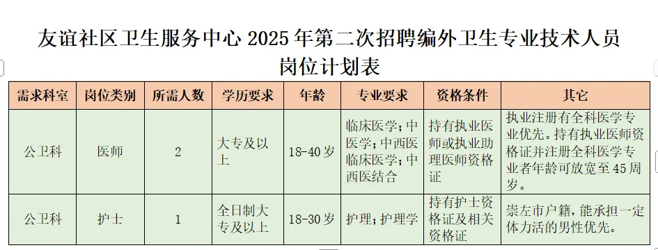 2025年崇左市江州區(qū)友誼社區(qū)衛(wèi)生服務(wù)中心公開招聘編外聘用衛(wèi)生專業(yè)技術(shù)人員公告
