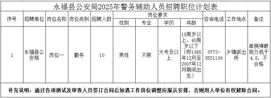 計(jì)劃招聘警務(wù)輔助人員10名。具體崗位、招聘人數(shù)、資格條件詳見《永福縣公安局輔警招聘計(jì)劃表》。