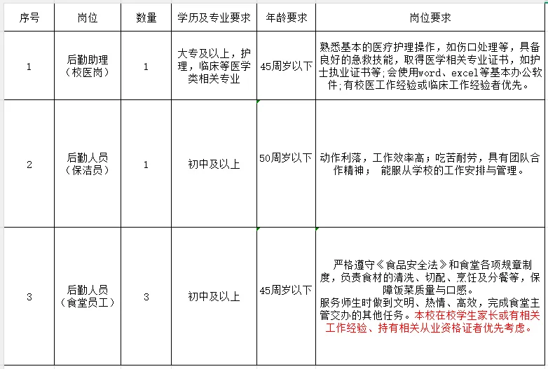 3.具有相應(yīng)崗位文化程度,身體健康、手腳敏捷、具有團(tuán)隊合作精神,能服從學(xué)校安排及管理。
