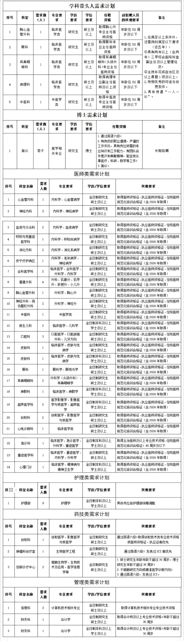 為進一步完善現(xiàn)有人才隊伍,促進醫(yī)院學科發(fā)展,提升醫(yī)院綜合實力,因業(yè)務發(fā)展需要,現(xiàn)面向社會進行公開招聘,具體招聘崗位如下: