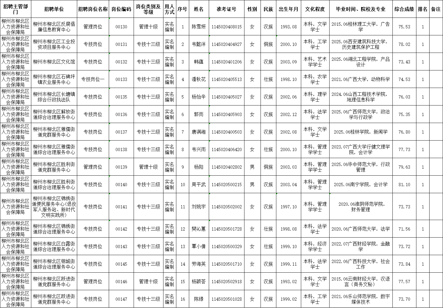 柳北區(qū)2025年度下半年事業(yè)單位公開(kāi)考試招聘工作人員擬聘用人選公示(第一批)