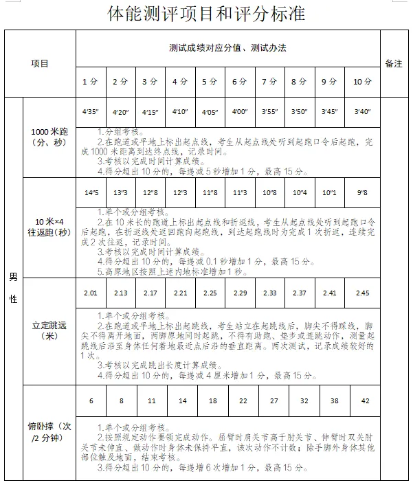 任一單項(xiàng)得分為0的視為“不合格”,予以淘汰。體能測(cè)評(píng)所有項(xiàng)目均只測(cè)試一次。(標(biāo)準(zhǔn)見附件)