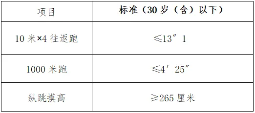 參加體能測評的人員為筆試考試成績合格的考生。體能測評的標(biāo)準(zhǔn),參照《公安機關(guān)錄用人民警察體能測評項目和標(biāo)準(zhǔn)》的標(biāo)準(zhǔn),具體如下: