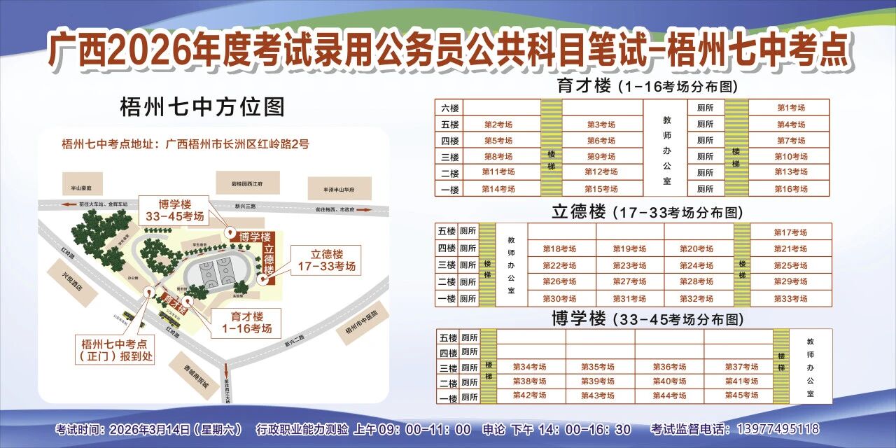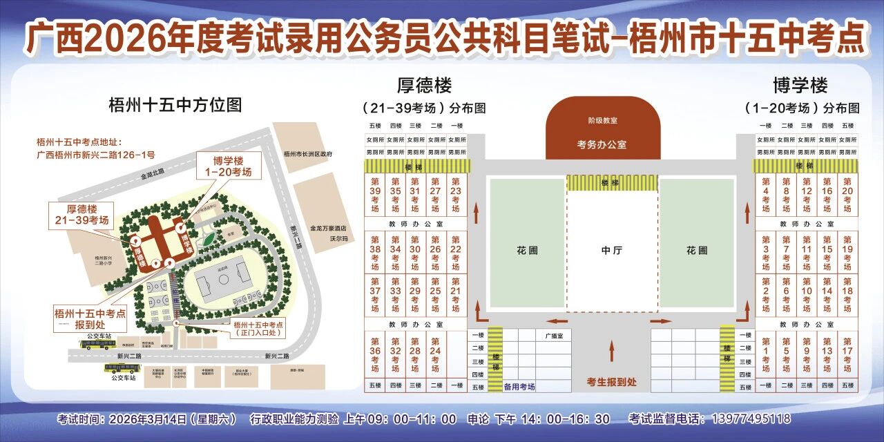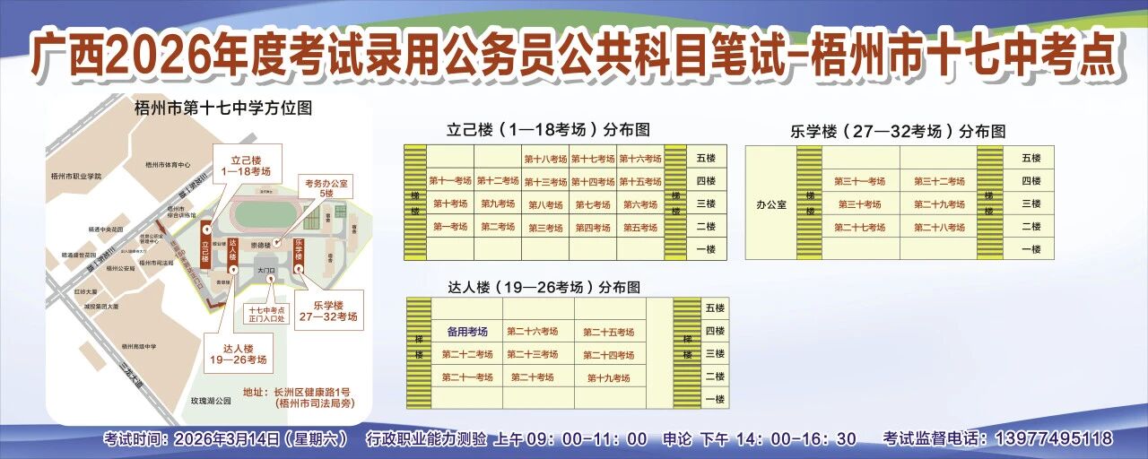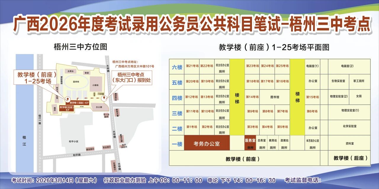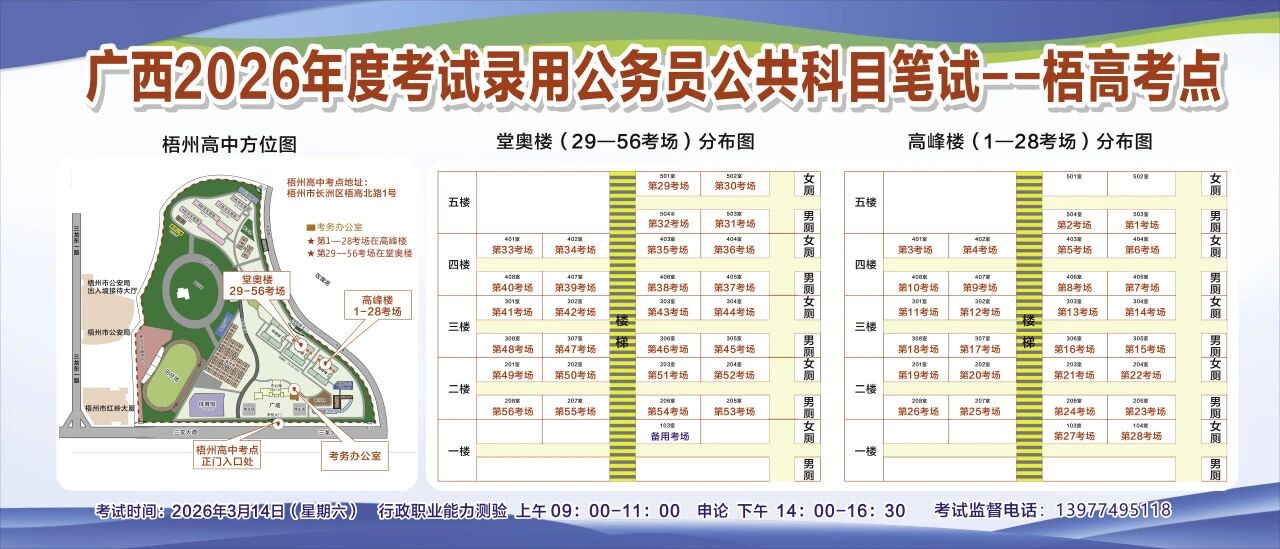一、廣西2026年度考試錄用公務(wù)員(選調(diào)生)公共科目筆試將于3月14日舉行,梧州考區(qū)共設(shè)置10個考點,請考生提前熟悉各自考點位置、周邊環(huán)境及交通情況,考試當(dāng)天提前出門做好準(zhǔn)備,準(zhǔn)時參加考試。