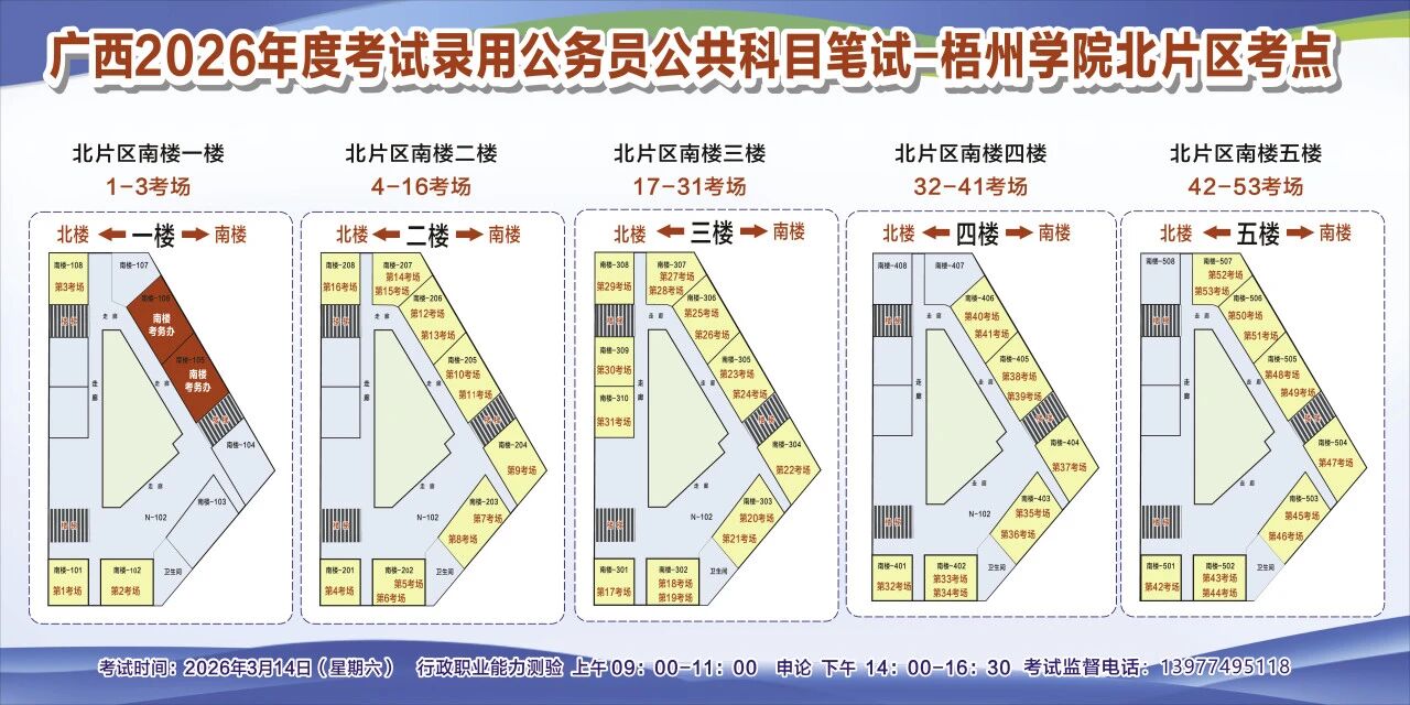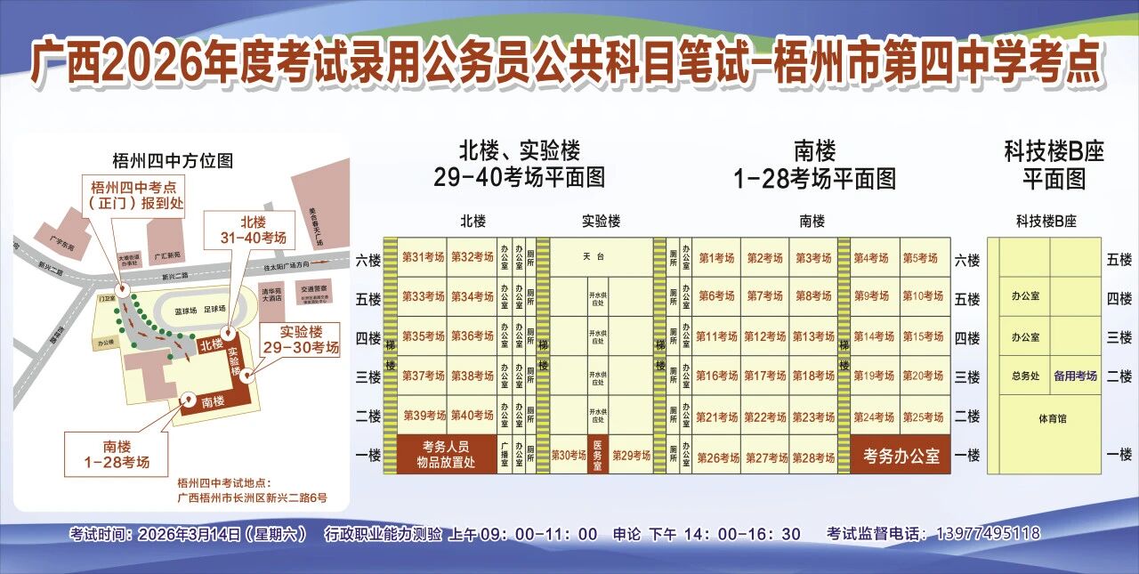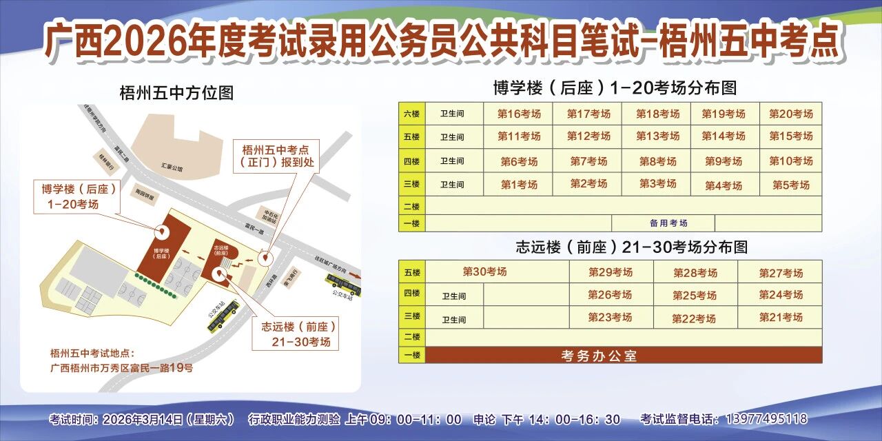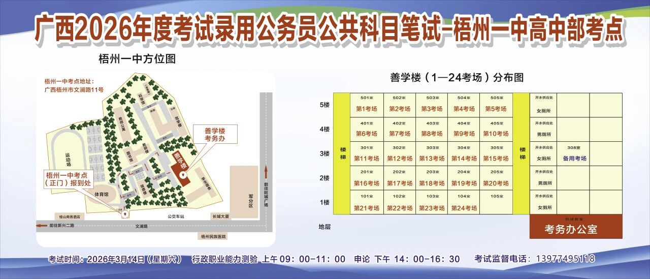 一、廣西2026年度考試錄用公務(wù)員(選調(diào)生)公共科目筆試將于3月14日舉行,梧州考區(qū)共設(shè)置10個考點,請考生提前熟悉各自考點位置、周邊環(huán)境及交通情況,考試當(dāng)天提前出門做好準(zhǔn)備,準(zhǔn)時參加考試。