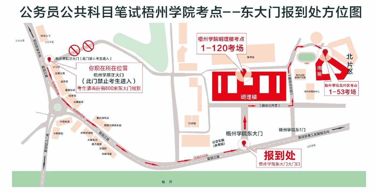 (九)梧州學(xué)院明理教學(xué)樓、梧州學(xué)院北片區(qū)(萬秀區(qū)富民三路82號)特別提醒:明理教學(xué)樓和北片區(qū)屬不同考點,請考生看清楚準(zhǔn)考證,切勿走錯考場。