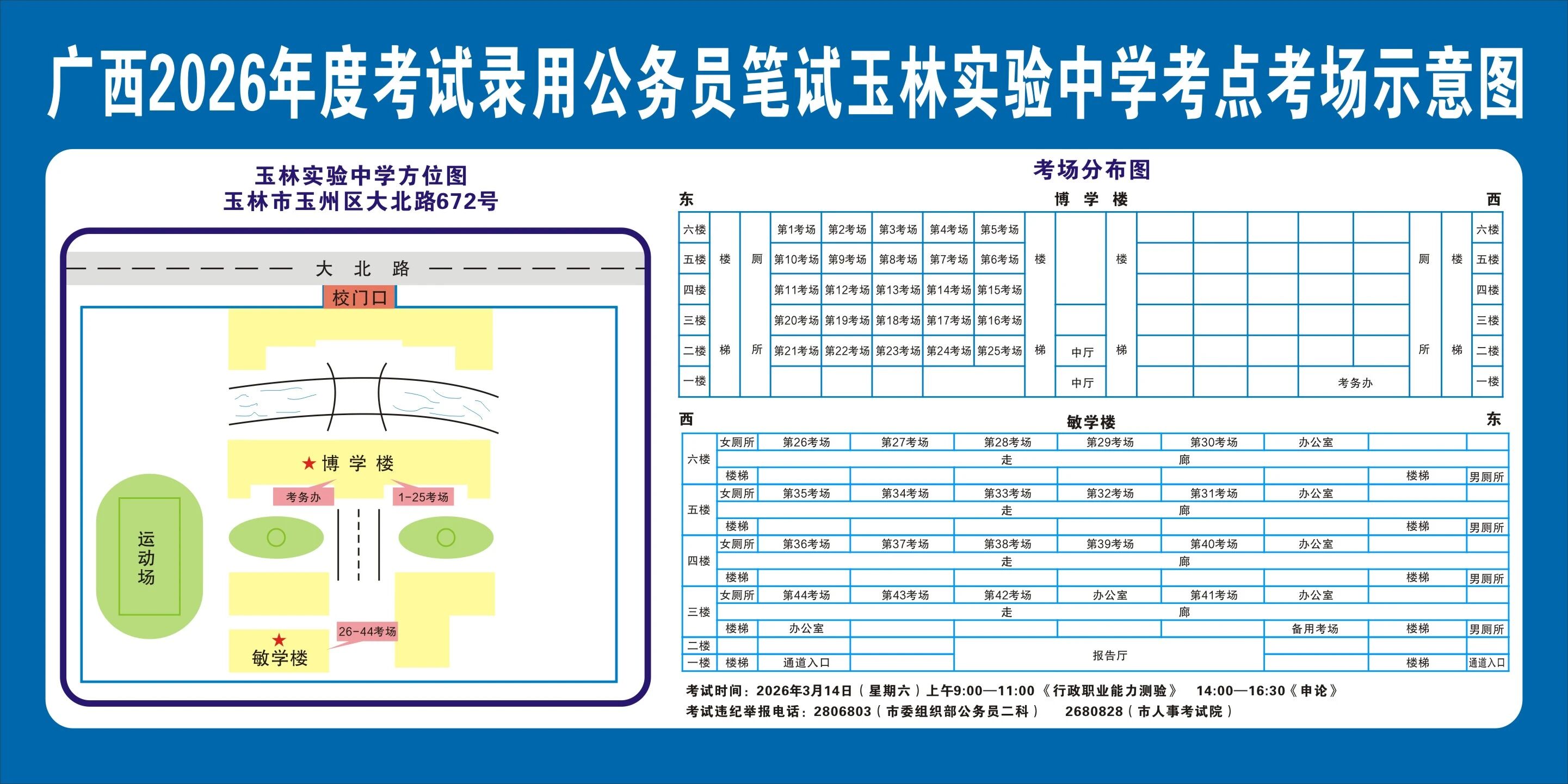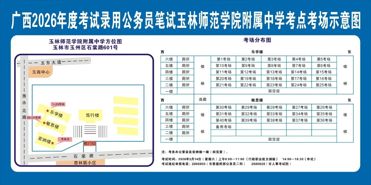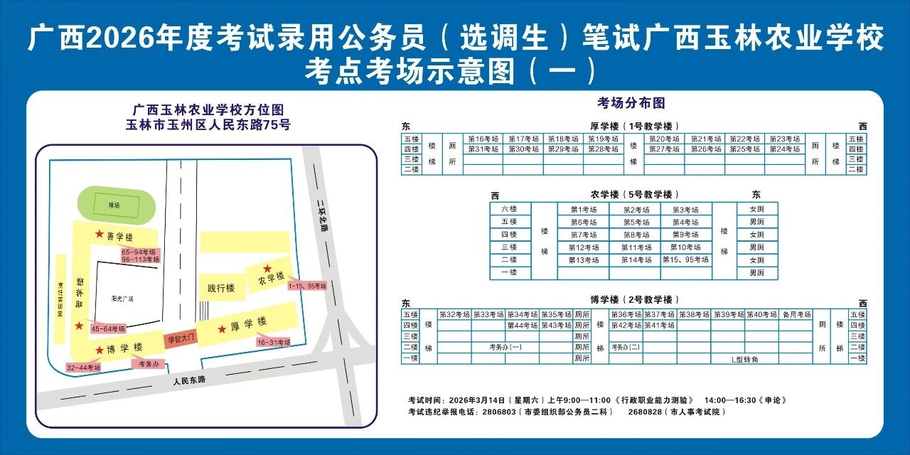 請及時(shí)登錄“廣西人事考試網(wǎng)”打印筆試準(zhǔn)考證并妥善保管,仔細(xì)查看準(zhǔn)考證上的考點(diǎn)信息。本次考試玉林市考區(qū)共設(shè)10個(gè)考點(diǎn),各考點(diǎn)名稱及地址如下: