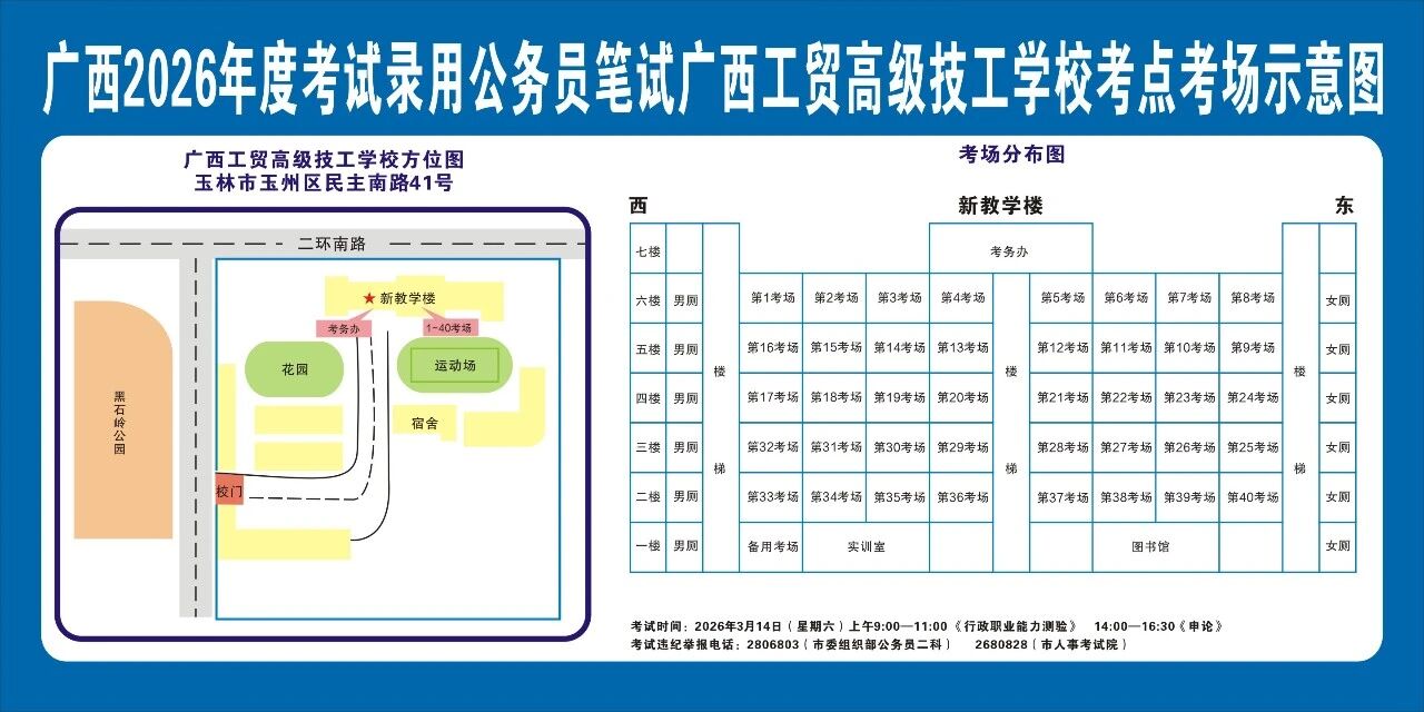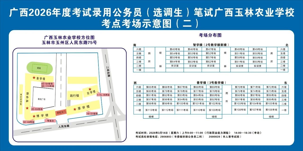 廣西2026年度考試錄用公務(wù)員(選調(diào)生)筆試將于3月14日舉行,為進(jìn)一步提升玉林考區(qū)服務(wù)保障質(zhì)量,現(xiàn)就有關(guān)注意事項(xiàng)提示如下,請廣大考生做好應(yīng)試準(zhǔn)備工作,準(zhǔn)確掌握考試時(shí)間、考點(diǎn)地址及相關(guān)注意事項(xiàng)。