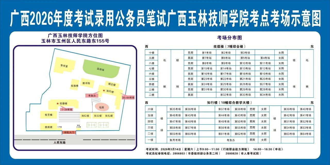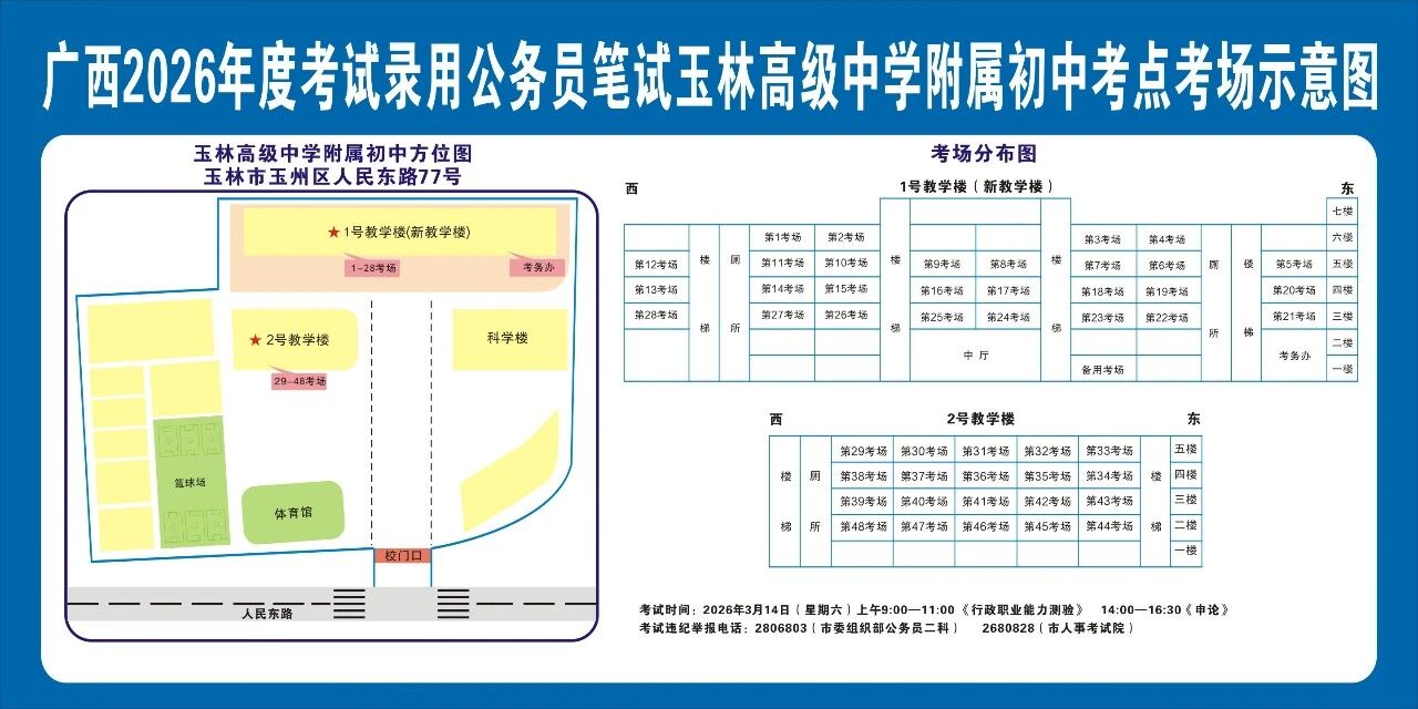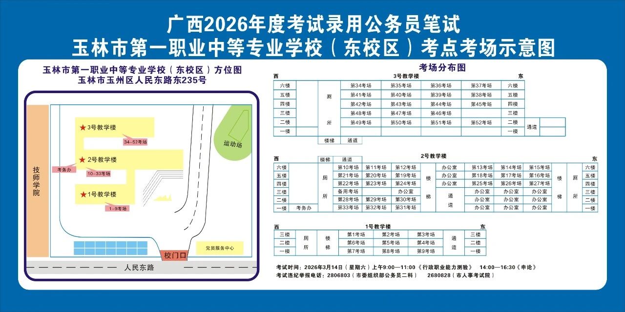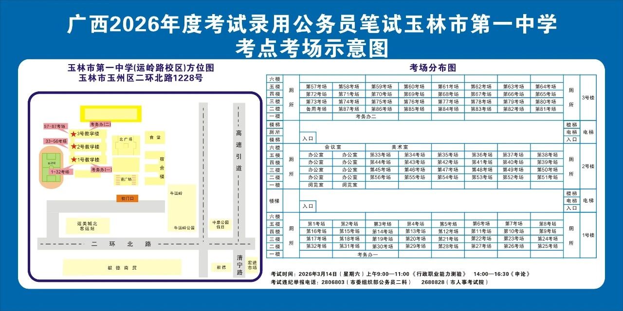 請?zhí)崆傲私獗救怂诳键c(diǎn)具體位置,熟悉考點(diǎn)周邊情況,特別是考點(diǎn)周邊的食宿、交通情況,合理做好食宿安排和出行計(jì)劃。需要特別注意的是:玉林市第一職業(yè)中等專業(yè)學(xué)??键c(diǎn)是設(shè)在該校的東校區(qū)(人民東路東235號);玉林市第一中學(xué)考點(diǎn)是設(shè)在該校的運(yùn)嶺路校區(qū)(二環(huán)北路1228號)!