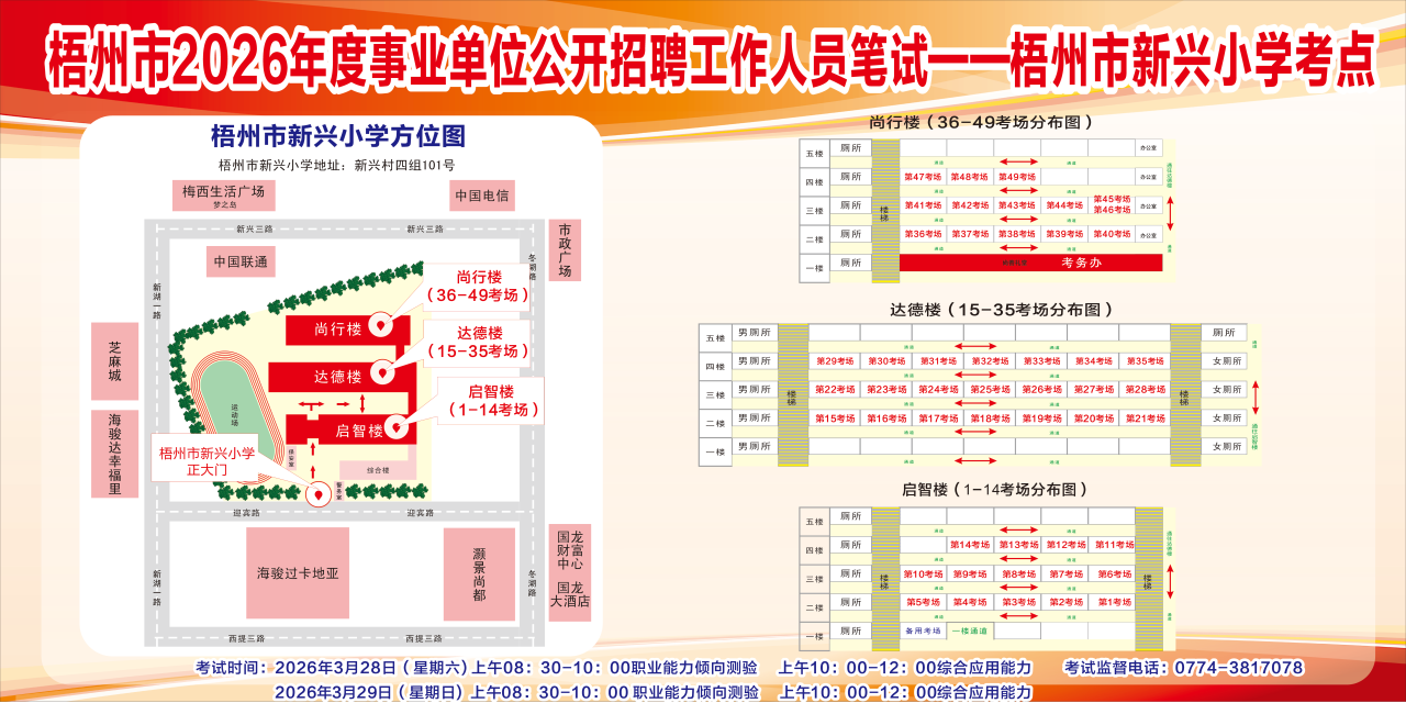 梧州考區(qū)3月28日綜合管理(A類)考試的考點(diǎn)學(xué)校:三中、四中、五中、十五中、十七中、新興小學(xué)、新興二路小學(xué)。3月29日社會(huì)科學(xué)專技(B類)、自然科學(xué)專技(C類)、中小學(xué)教師(D類)和醫(yī)療衛(wèi)生(E類)考試的考點(diǎn)學(xué)校:一中高中部、三中、四中、五中、七中、十五中、十七中、梧州高中、梧州學(xué)院明理教學(xué)樓、新興小學(xué)、新興二路小學(xué)。