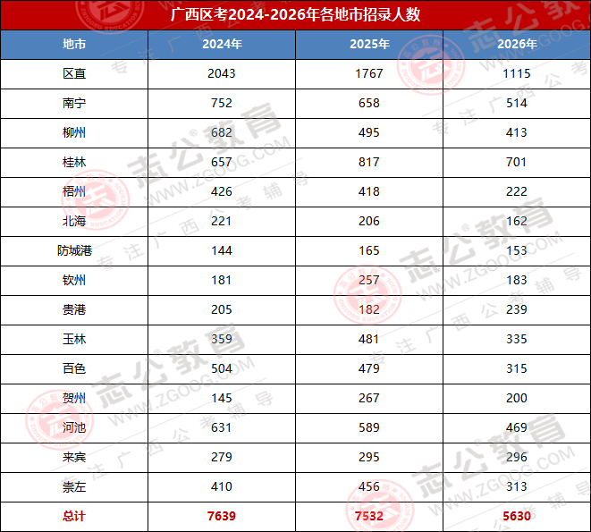 2026廣西區(qū)考招錄人數(shù)較去年大幅度減少,2026年招錄公告,本次區(qū)考計(jì)劃招錄總?cè)藬?shù)為5630人,較2025年的7532人減少1902人,同比降幅達(dá)25.25%,是近年招錄規(guī)模收縮幅度較大的一年。