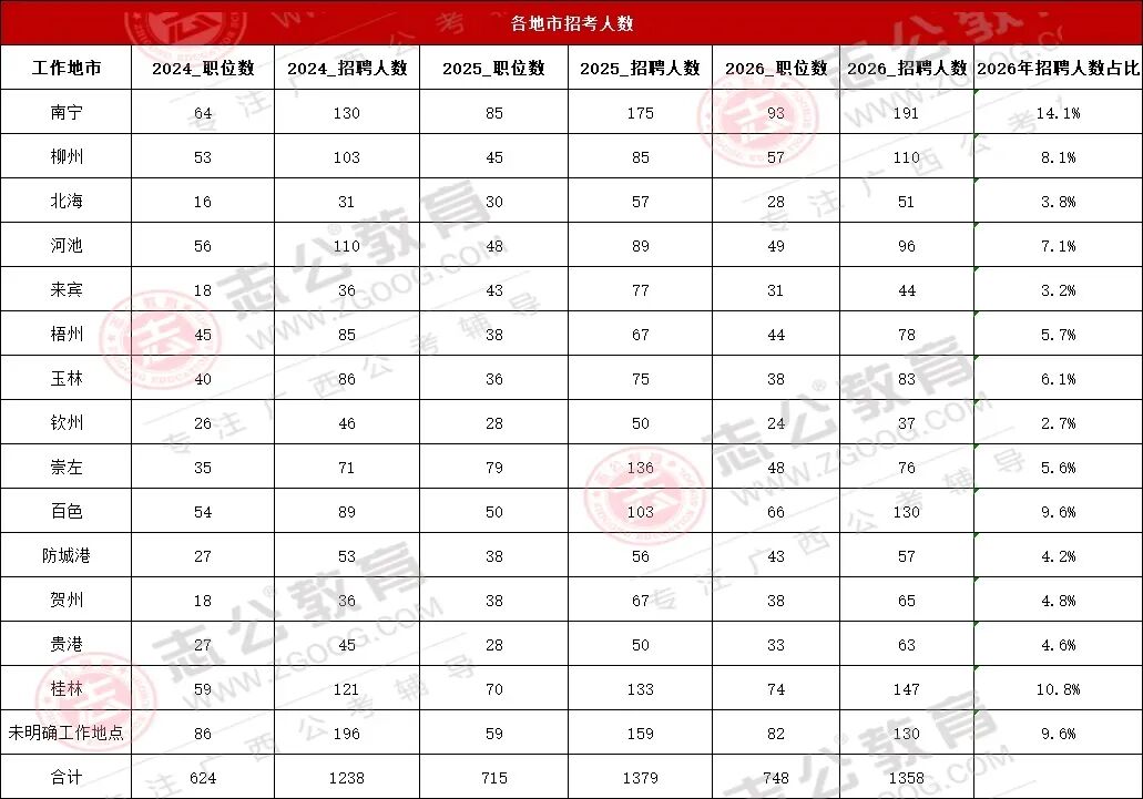 2026國考廣西招1358人,占全國招錄人數(shù)的3.56%,相比去年減少招錄人數(shù)21人。2026國考招錄人數(shù)呈縮減趨勢;基層崗位成主力;稅務(wù)、海關(guān)、邊檢為招錄大戶;應(yīng)屆生身份紅利顯著,超60%崗位限應(yīng)屆報(bào)考。