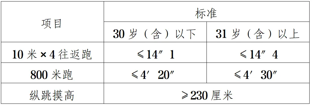 按照《關于印發(fā)〈公安機關錄用人民警察體能測評項目和標準〉的通知》(公政治〔2024〕60號)執(zhí)行。體能測評項目包括10米×4往返跑、1000米(男)/800米(女)跑、縱跳摸高等3個項目。其中,綜合管理類、執(zhí)法勤務類職位測查全部3個項目,警務技術類職位免予測查1000米(男)/800米(女)跑項目;對于專業(yè)人才緊缺難以形成競爭的特殊職位(緊缺職位),報考人員需在參加體能測評前,從3項體能測評項目中選擇2項參加測試。凡應測項目中任意一項不達標的,即為體能測評不合格。具體如下: